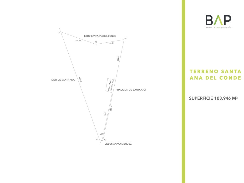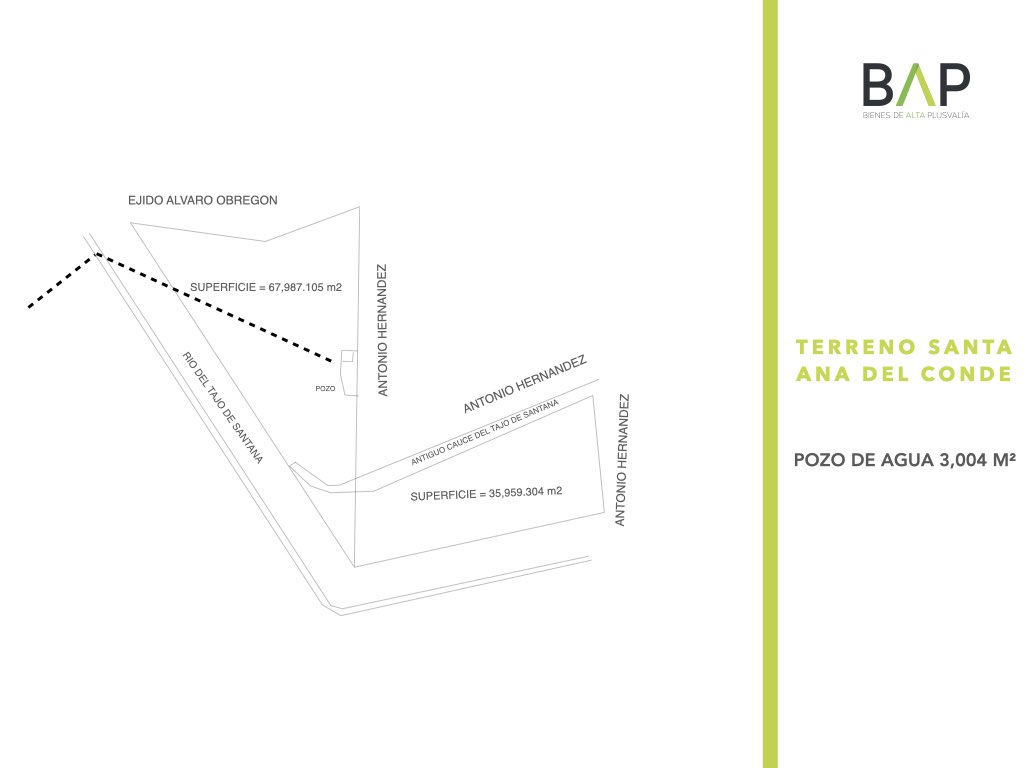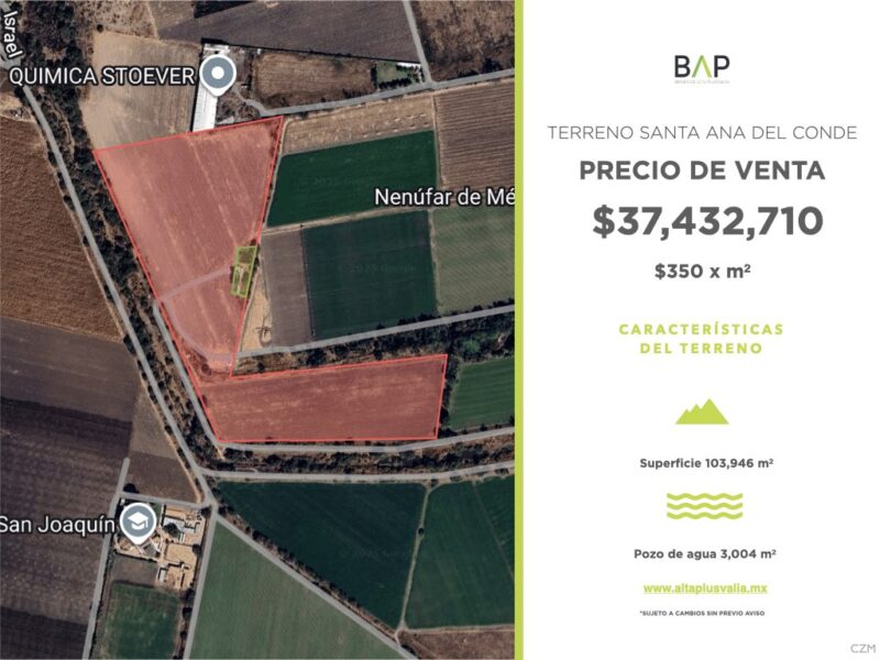 Amplio terreno en Santa Ana del Conde con una superficie total de 103,946 m², ideal para proyectos de inversión, desarrollo industrial, agrícola o habitacional gracias a su excelente extensión y ubicación estratégica. La propiedad cuenta además con un pozo de agua de 3,004 m², lo que brinda un recurso invaluable para actividades productivas, garantizando autosuficiencia hídrica y mayor plusvalía. Su dimensión permite planear distintos usos con gran potencial de crecimiento, convirtiéndolo en una oportunidad única para inversionistas y desarrolladores que buscan un espacio versátil y con alto valor a futuro.